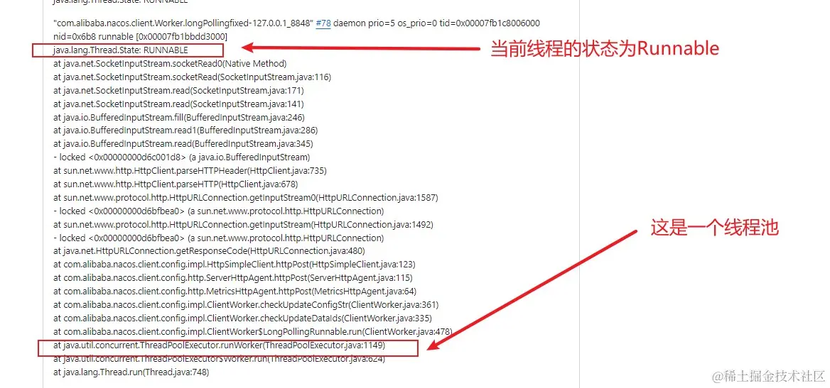 Runnable说明当前线程在执行或者在等待资源,例如I/O,或者处理器等。我们接着看堆栈信息: