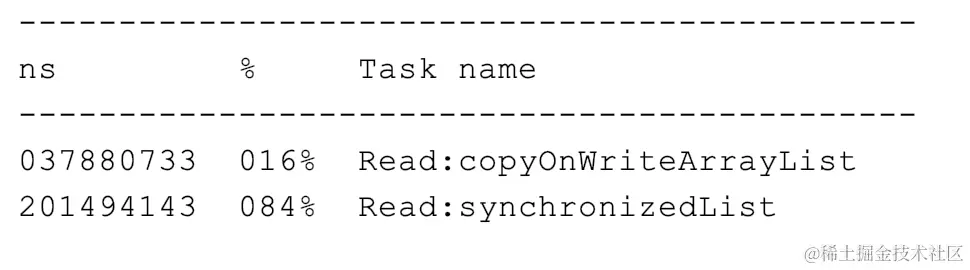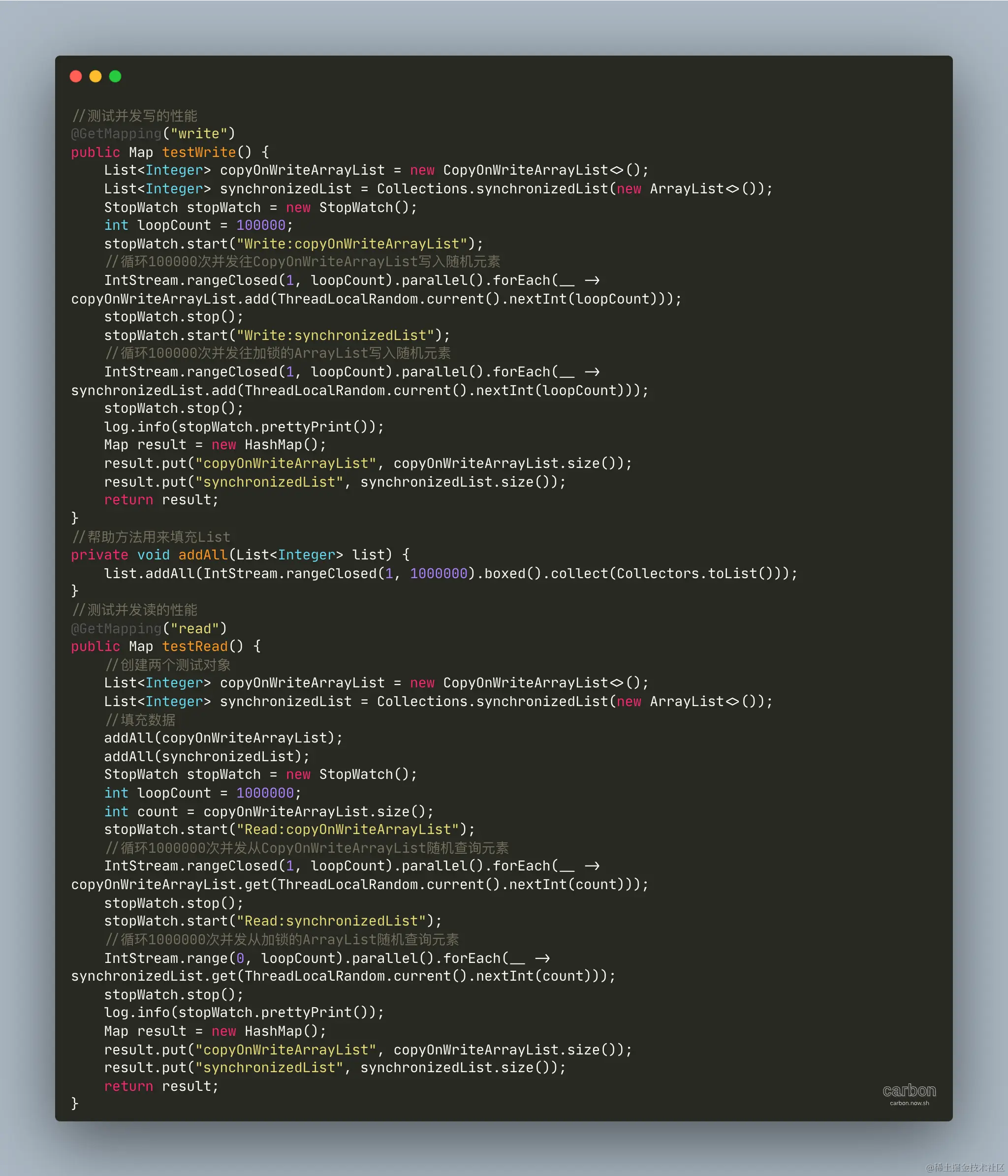 我们写一段测试代码,来比较下使用 CopyOnWriteArrayList 和普通加锁方式 ArrayList 的读写性能吧。在这段代码中我们针对并发读和并发写分别写了一个测试方法,测试两者一定次数的写或读操作的耗时。