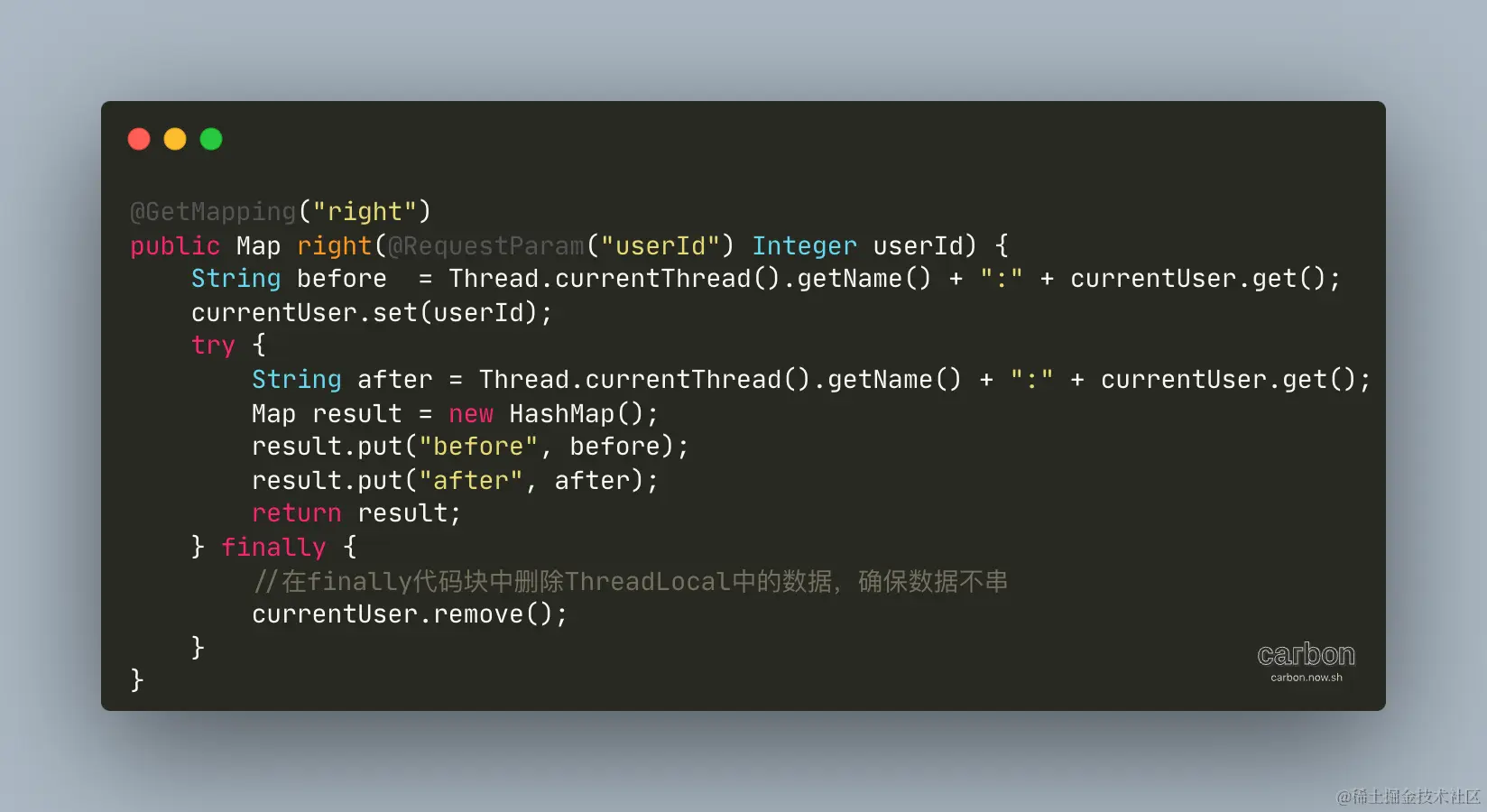 理解了这个知识点后,我们修正这段代码的方案是,在代码的 finally 代码块中,显式清除 ThreadLocal 中的数据。这样一来,新的请求过来即使使用了之前的线程也不会获取到错误的用户信息了。修正后的代码如下:
