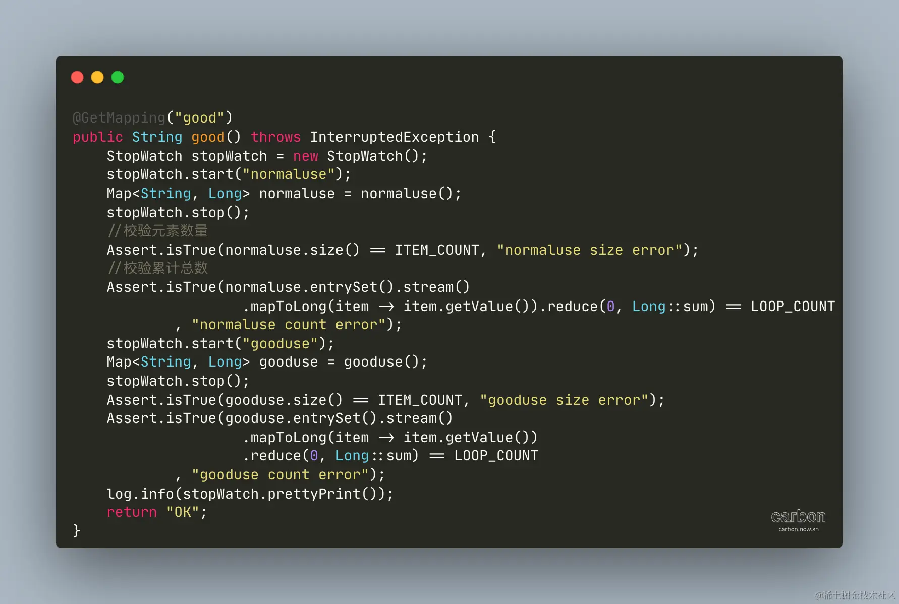 这段测试代码并无特殊之处,使用 StopWatch 来测试两段代码的性能,最后跟了一个断言判断 Map 中元素的个数以及所有 Value 的和,是否符合预期来校验代码的正确性。测试结果如下: