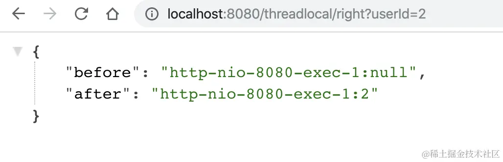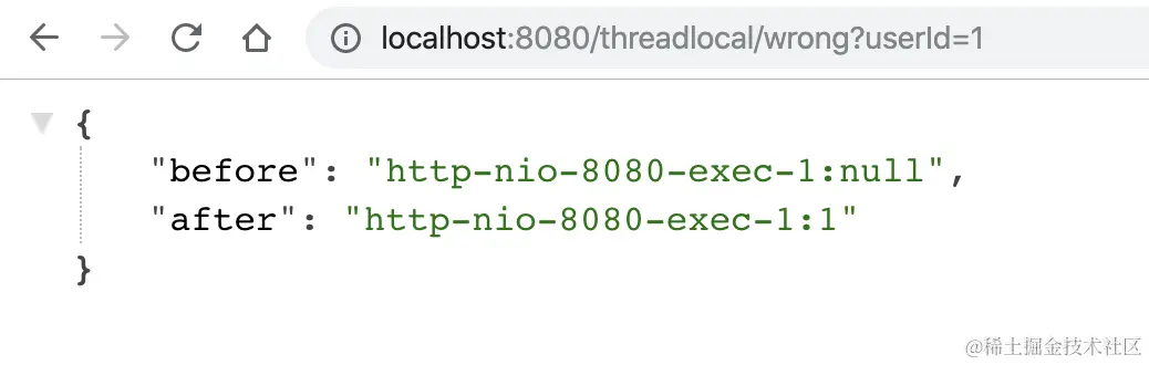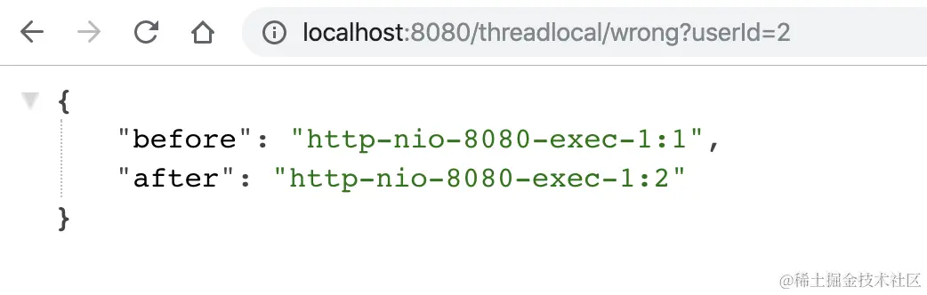 随后用户 2 来请求接口,这次就出现了 Bug,第一和第二次获取到用户 ID 分别是 1 和 2,显然第一次获取到了用户 1 的信息,原因就是 Tomcat 的线程池重用了线程。从图中可以看到,两次请求的线程都是同一个线程:http-nio-8080-exec-1。