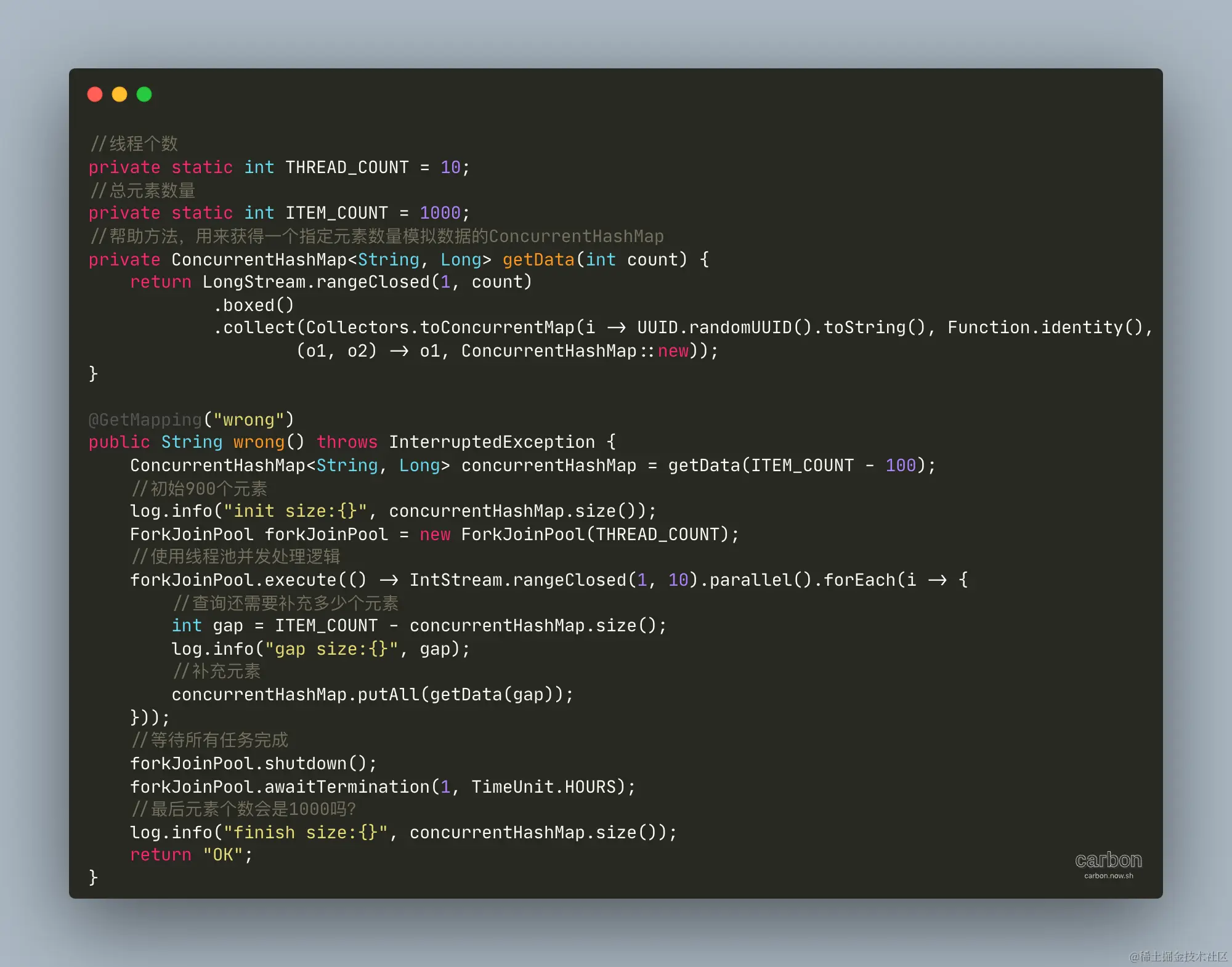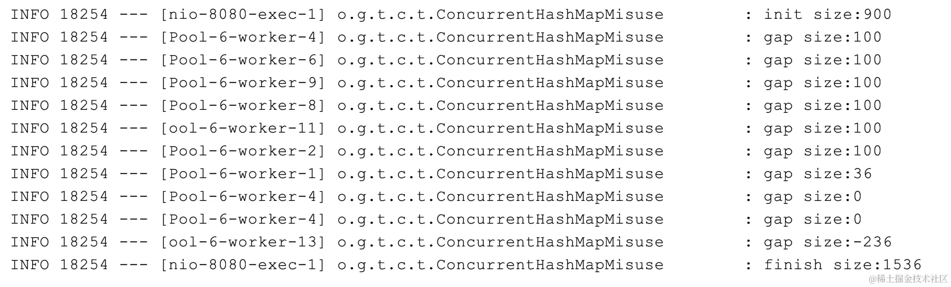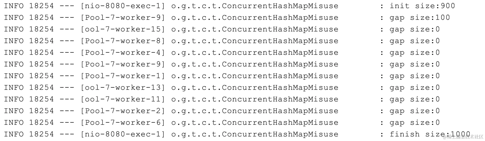 我在相当多的业务代码中看到过这个误区,比如下面这个场景。有一个含 900 个元素的 Map,现在再补充 100 个元素进去,这个补充操作由 10 个线程并发进行。开发人员误以为使用了 ConcurrentHashMap 就不会有线程安全问题,于是不加思索地写出了下面的代码:在每一个线程的代码逻辑中先通过 size 方法拿到当前元素数量,计算 ConcurrentHashMap 目前还需要补充多少元素,并在日志中输出了这个值,然后通过 putAll 方法把缺少的元素添加进去。
