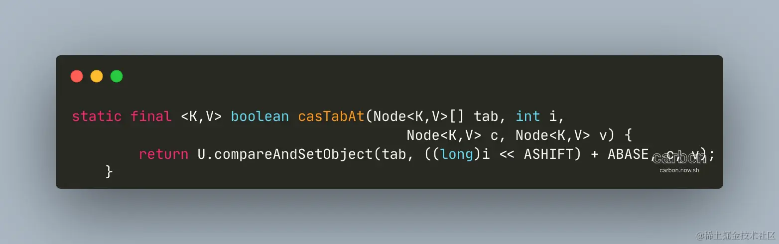 答案就在源码最核心的部分,也就是 Java 自带的 Unsafe 实现的 CAS。它在虚拟机层面确保了写入数据的原子性,比加锁的效率高得多: