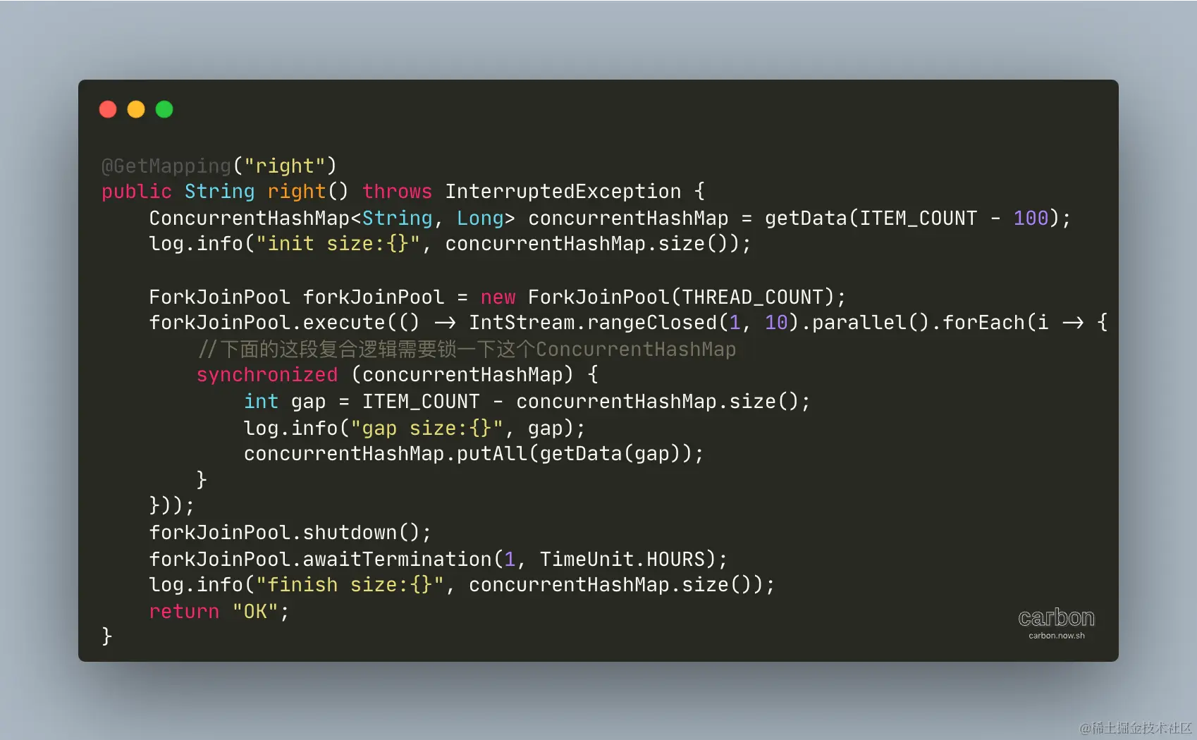 我们吸取之前的教训,直接通过锁的方式锁住 Map,然后做判断、读取现在的累计值、加 1、保存累加后值的逻辑。这段代码在功能上没有问题,但无法充分发挥 ConcurrentHashMap 的威力,改进后的代码如下: