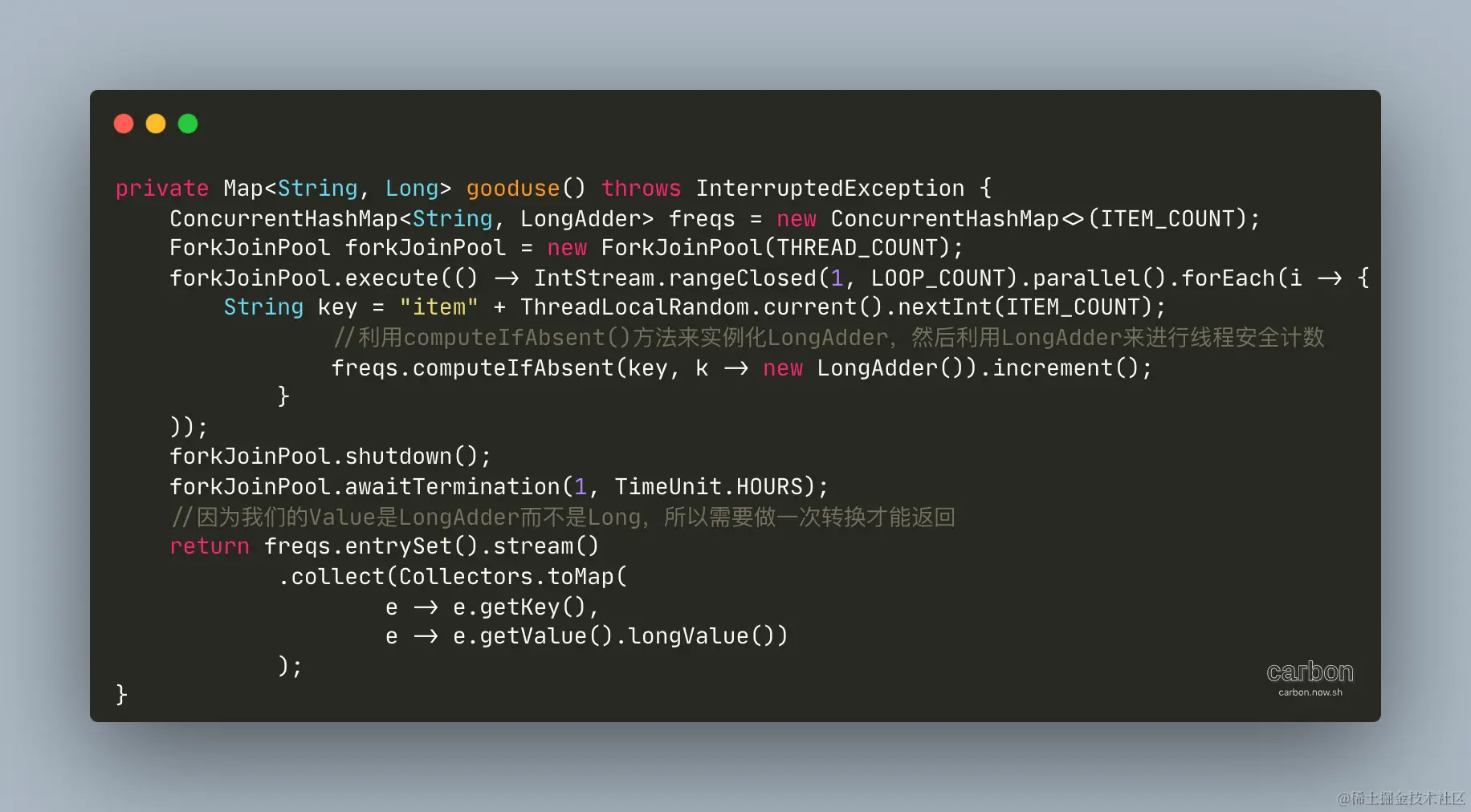 - 由于 computeIfAbsent 方法返回的 Value 是 LongAdder,是一个线程安全的累加器,因此可以直接调用其 increment 方法进行累加。
