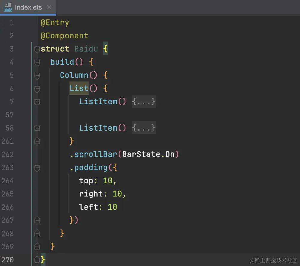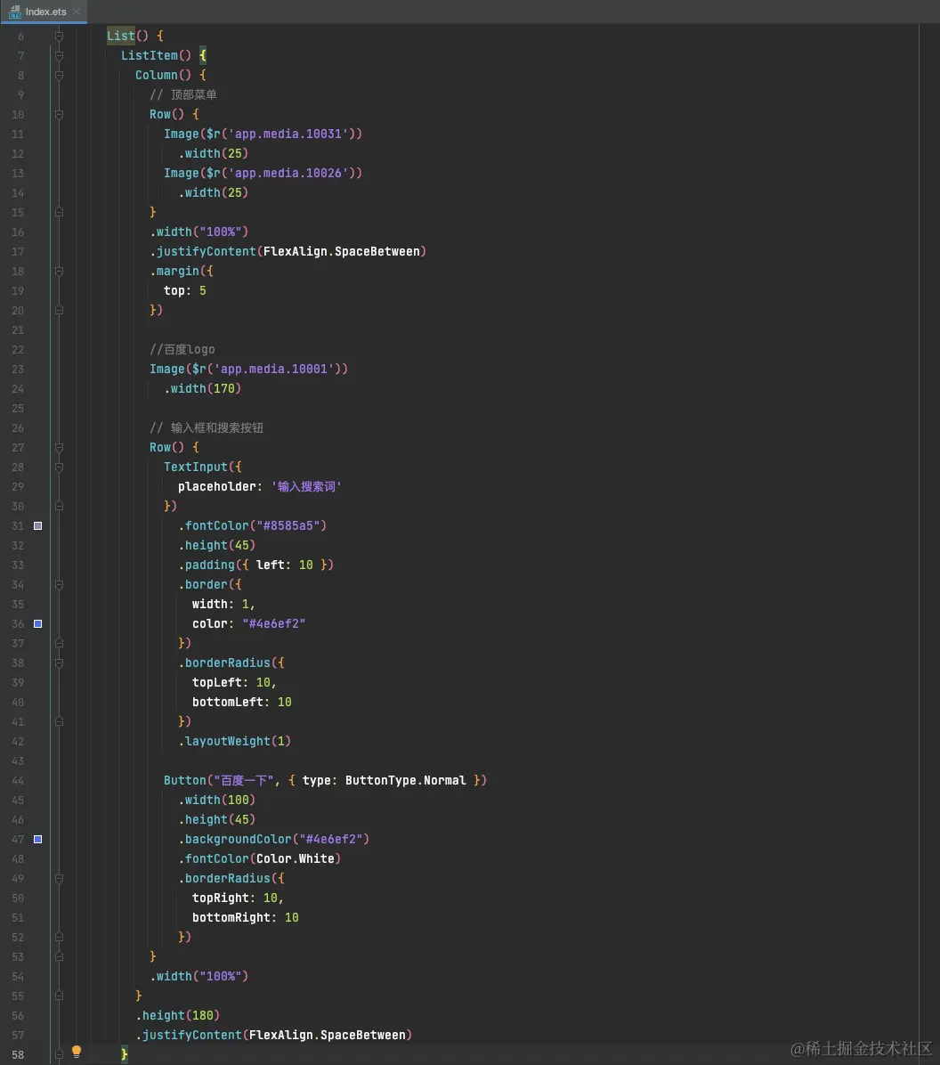 build 里面的第一层是一个 Column,表示是一种垂直的布局方式,如果是水平布局,就可以使用 Row。Column 里的第一层是 List,List 主要是能够提供滚动的能力,并且与 ListItem 固定搭配。这里可以把顶部的菜单、Logo、搜索框划放到第一个 ListItem里,下方的新闻列表放到第二个 ListItem 里,方便设置公共样式。