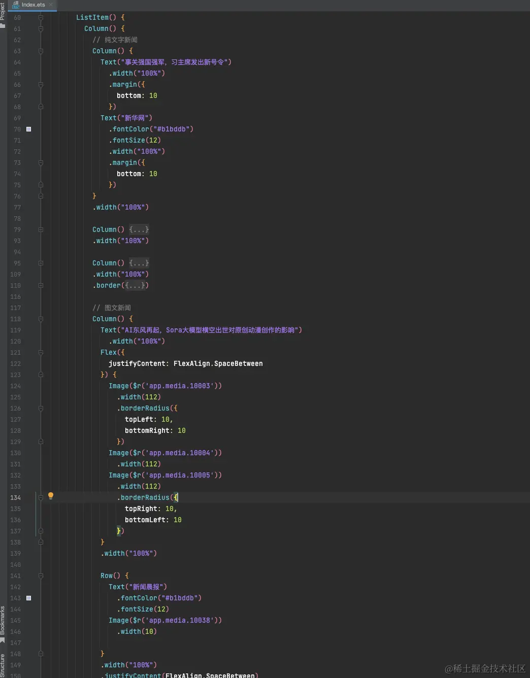 可以看到,纯文字新闻比较简单,使用 Column 组件,加上两个 Text 组件即可;图文新闻主要用上 Flex 布局,加上些 Image 组件,每一个独立的模块都可以用 Column 、Row 或 Flex 组件包裹。