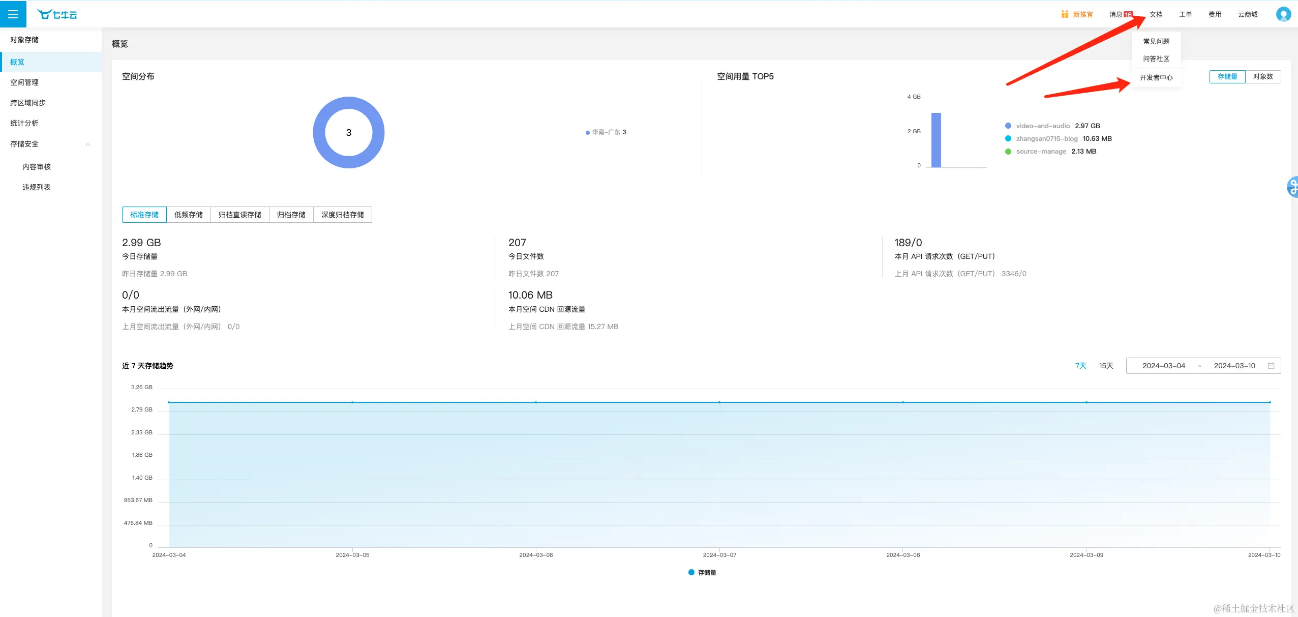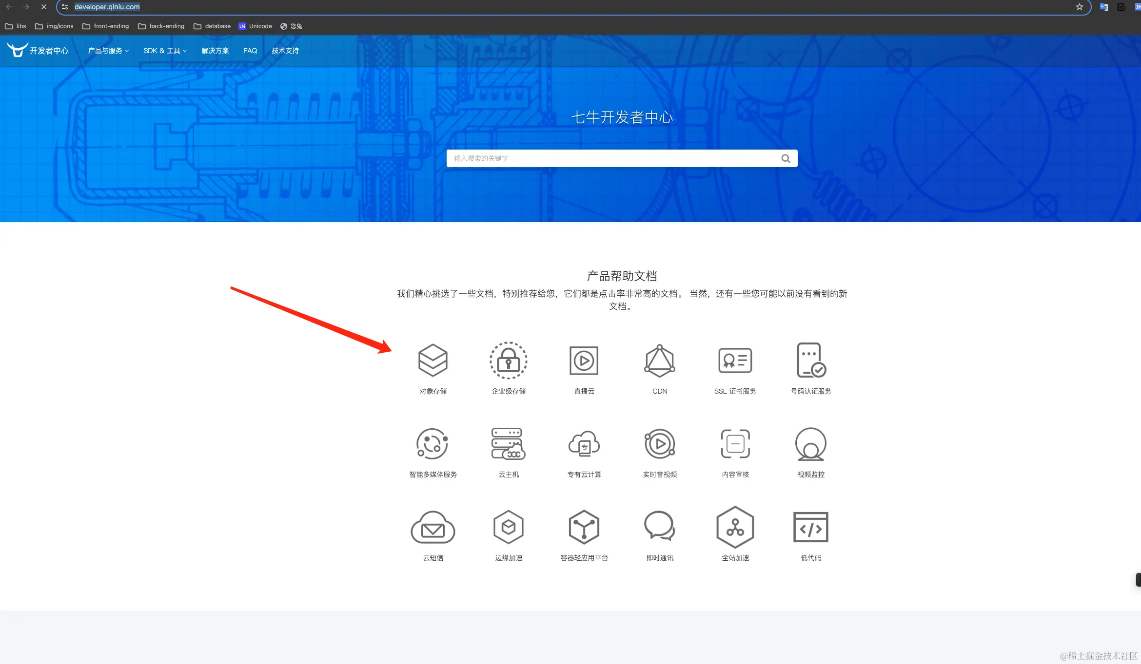 - 点击菜单右上角的文档按钮,选择【开发者中心】(developer.qiniu.com/)