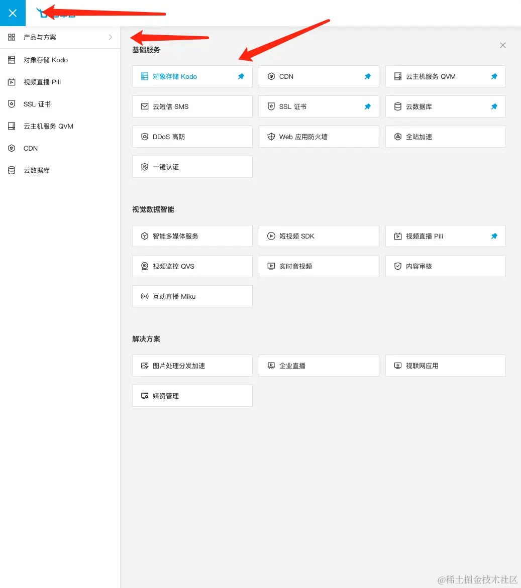 - 点击左上角的蓝色按钮,在抽屉中选择【产品与解决方案 > 对象存储 Kodo】