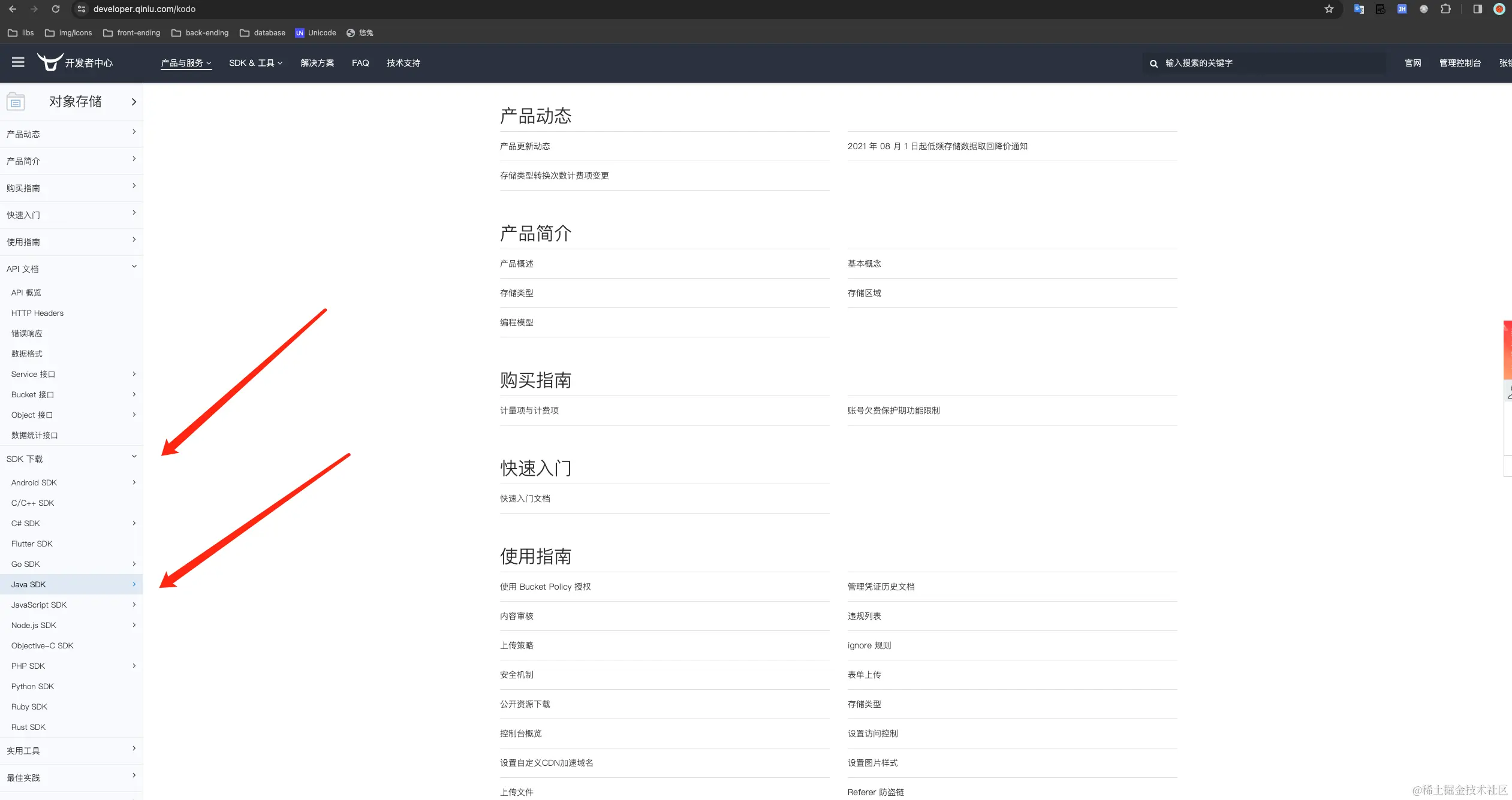 - 点击对象存储,选择 Java SDK (developer.qiniu.com/kodo/1239/j…)。