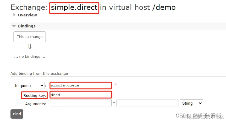 在RabbitMQ管理控制台新建队列simple.queue,并通过dead-letter-exchange属性指定交换机(队列中的死信就会投递到这个交换机中,这个交换机称为死信交换机):