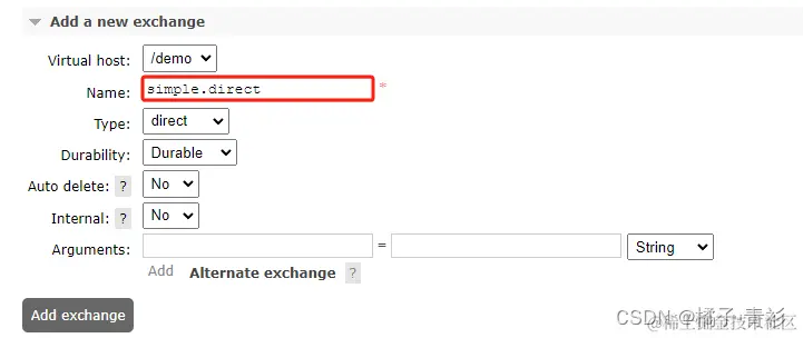 在RabbitMQ管理控制台新建交换机simple.direct: