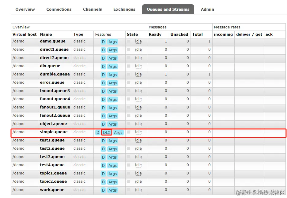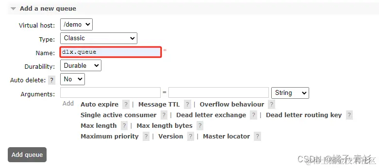 在RabbitMQ管理控制台新建队列dlx.queue:
