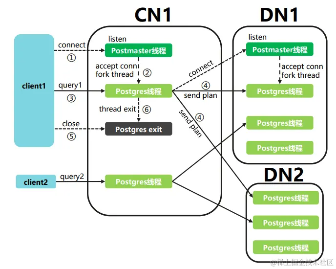- CN的postgres线程将查询计划下发给其他 CN/DN,查询结果沿原路径返回到客户端;