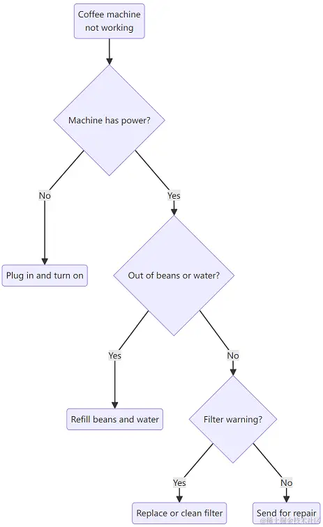 A(Coffee machine <br>not working) --> B{Machine has power?}