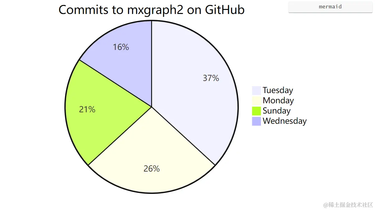 而你可以构建一个饼状图手动绘制。使用Mermaid语法可以非常容易地获得饼片的准确分布。在Mermaid代码中,您可以使用百分比值,也可以使用每个组的实际值。在下面的示例中,您可以看到哪些天是提交到mxgraph2最忙的日子。