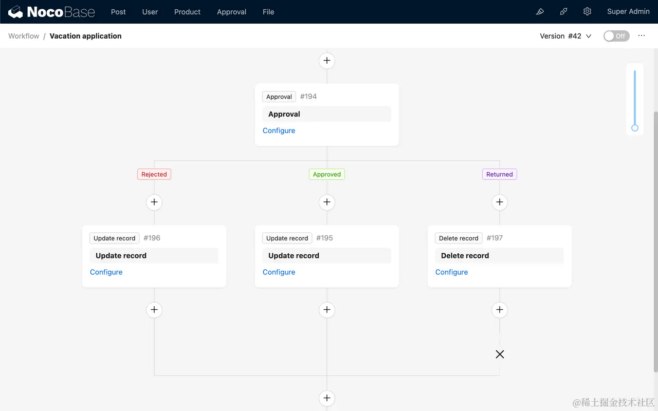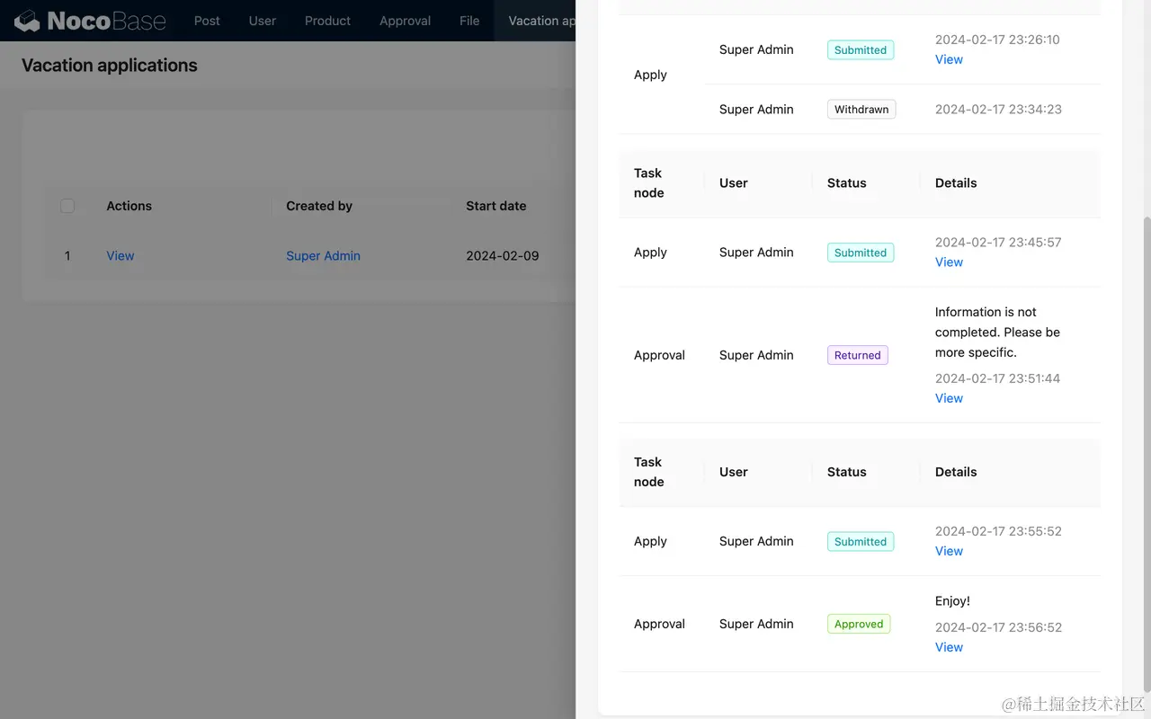 审批插件提供了专用的工作流类型(触发器)“发起审批”和专用于该流程的“审批”节点,结合 NocoBase 特有的自定义数据表和自定义区块,可以快速且灵活地创建与管理各类审批场景。