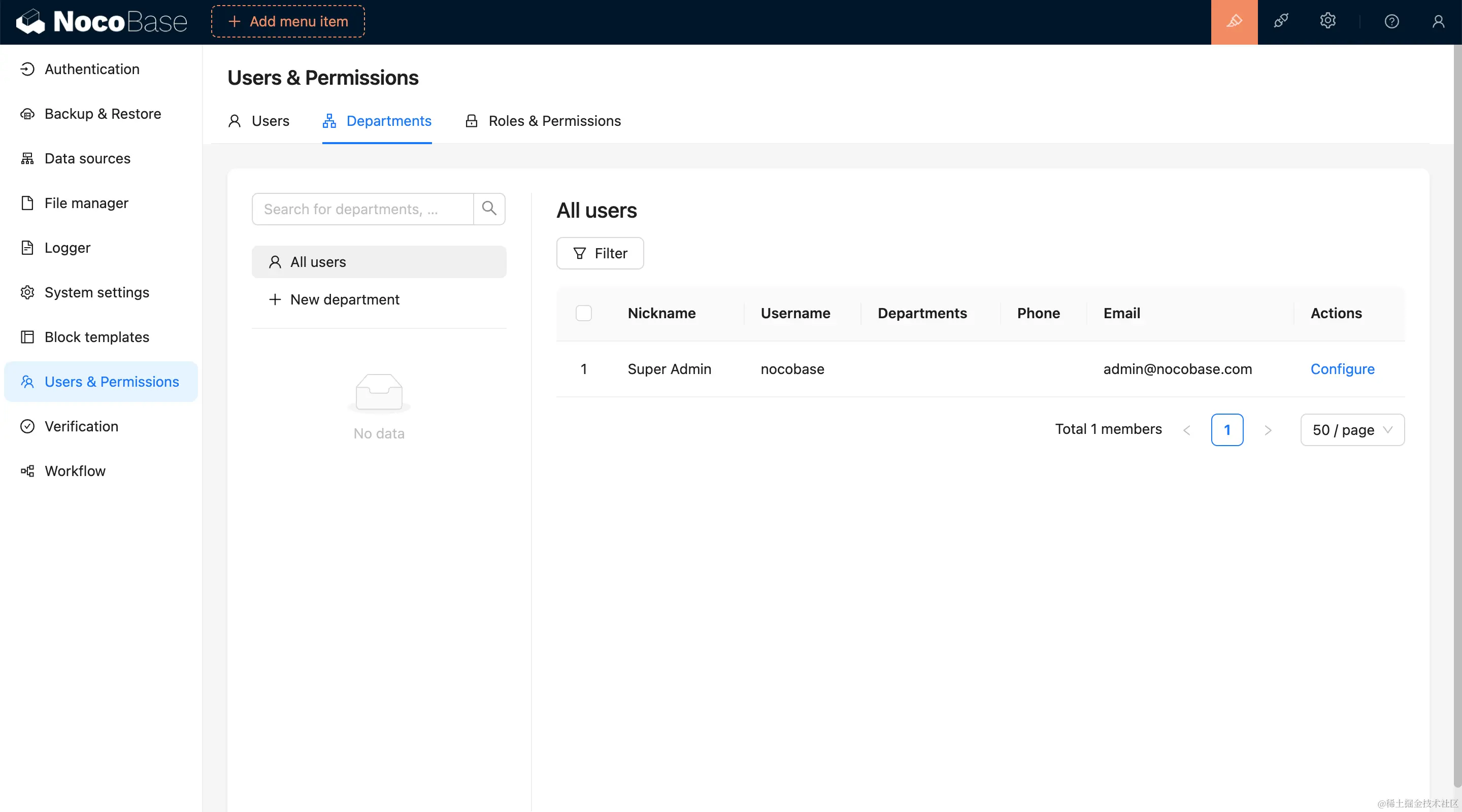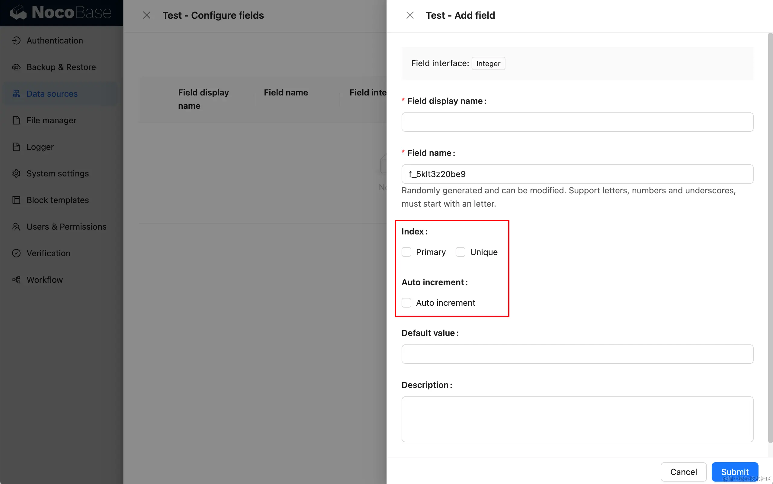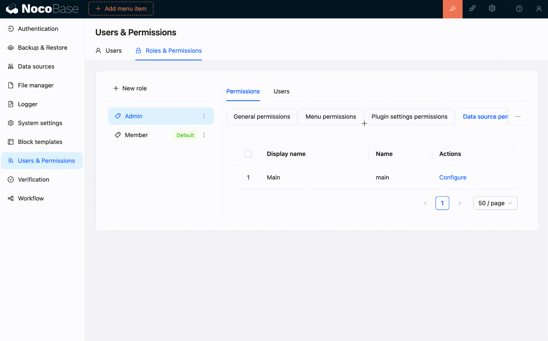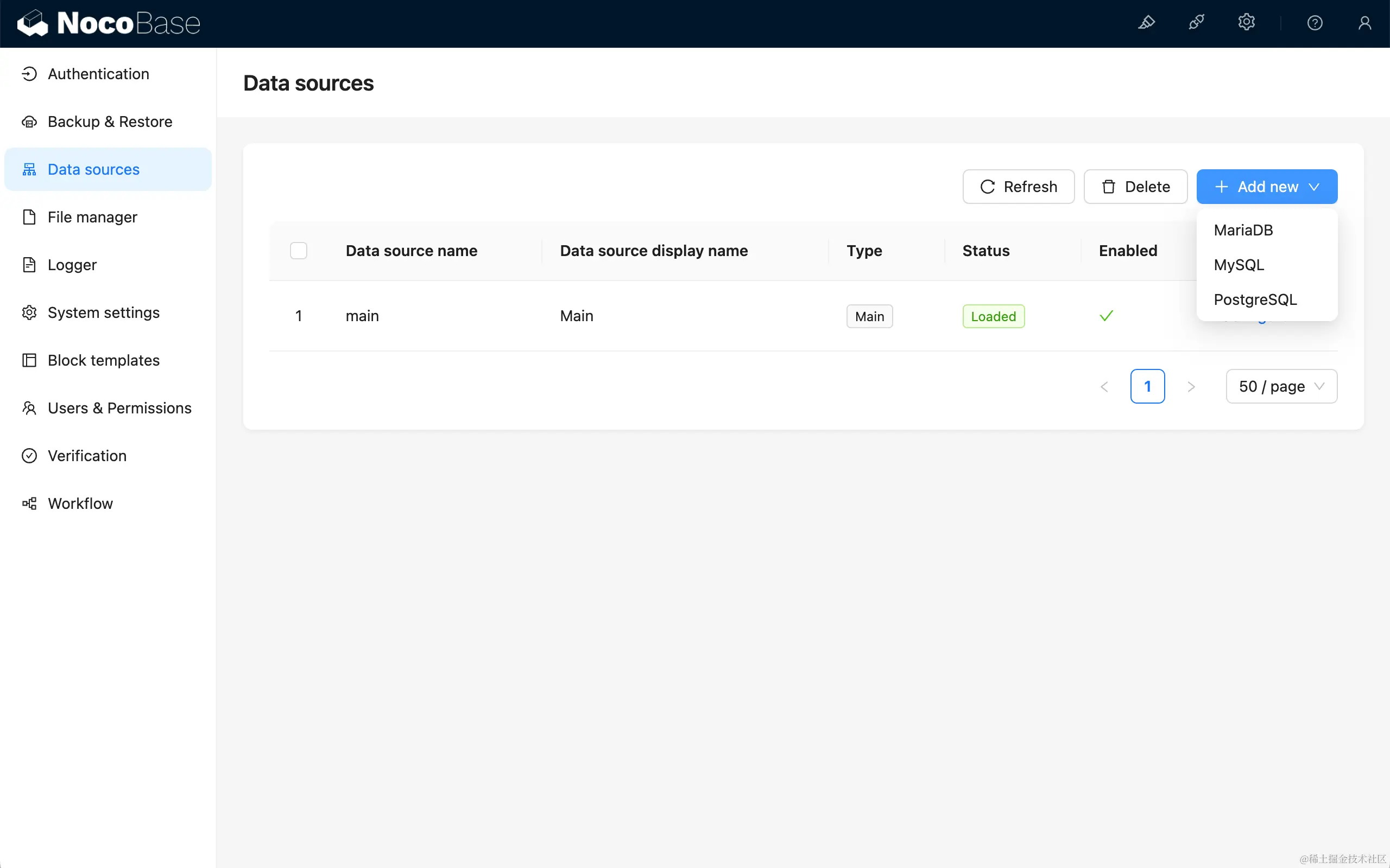 - 主数据库 Main:NocoBase 主数据库,支持 MySQL、PostgreSQL、SQLite 等关系型数据库。