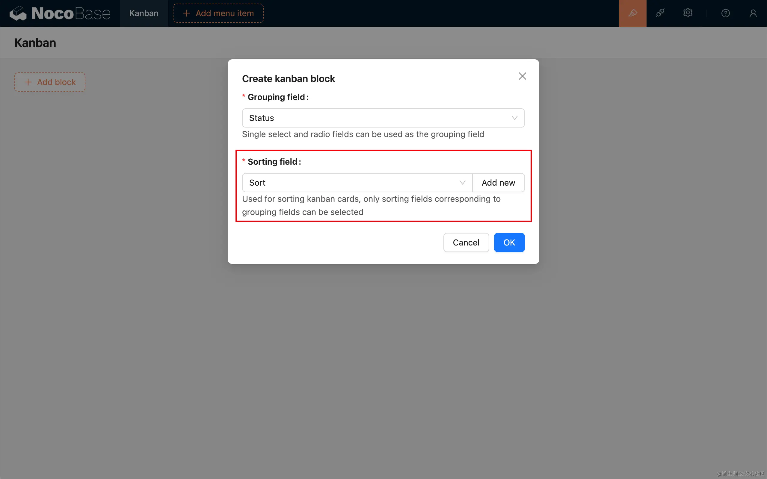 创建看板区块时,需要选择排序字段