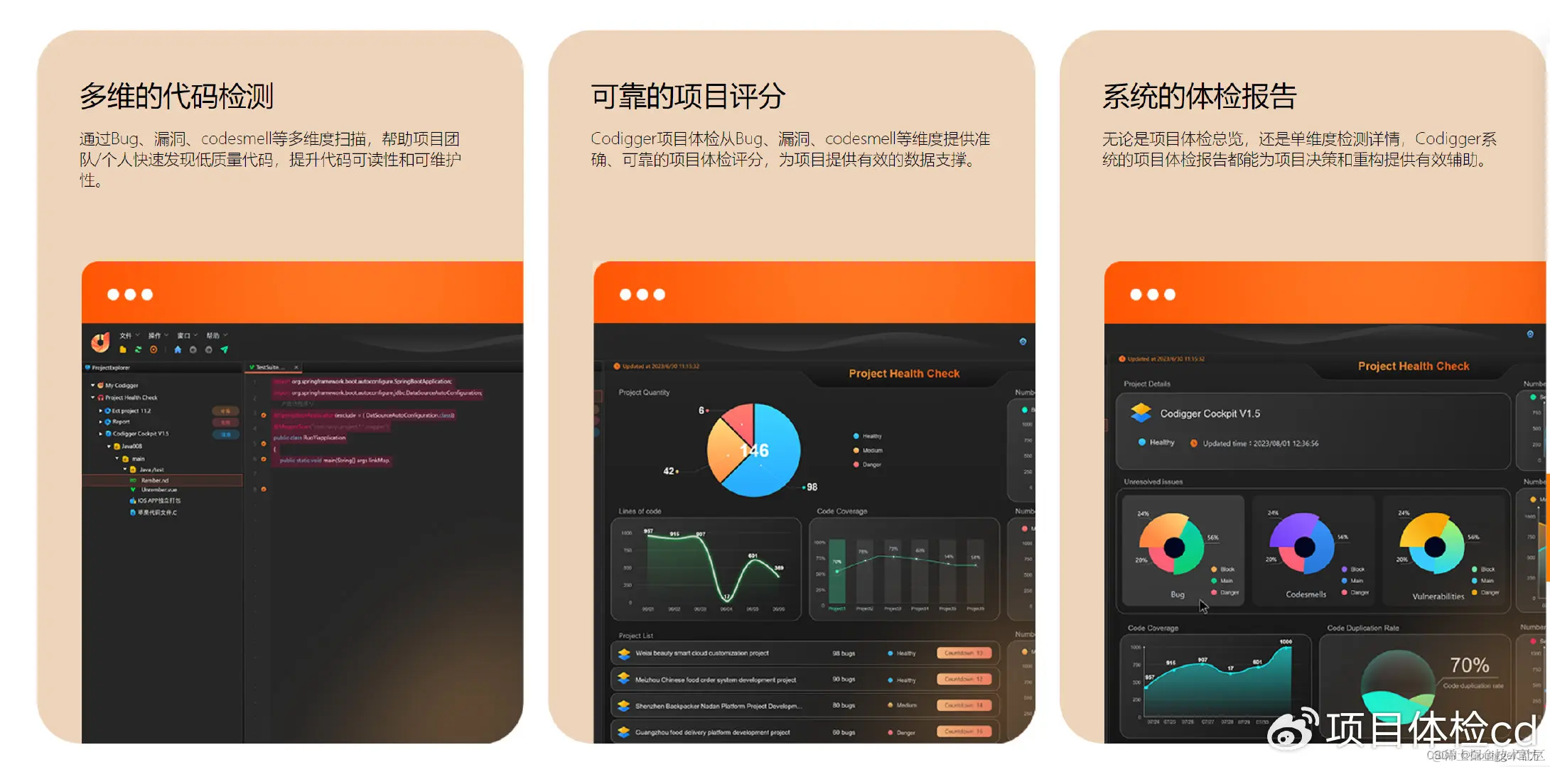 Codigger项目体检从Bug、漏洞、codesmell等维度提供准确、可靠的项目体检评分,为项目提供有效的数据支撑。
