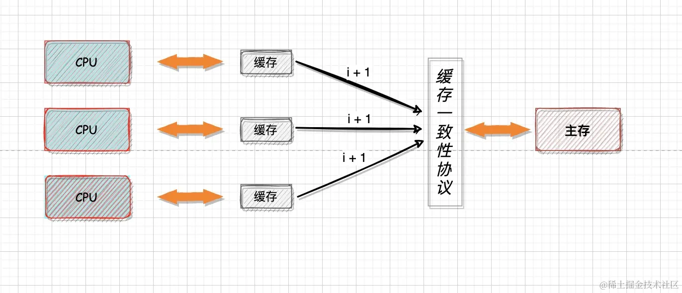 假如主存中的i为0,每个CPU缓存中的i也为0。3个CPU都对i进行了+1操作,按理说最后主存的i应该为3,但是实际i为1、2、3都有可能。所以,系统为了保证多CPU之间的缓存一致性,针对内存和缓存之间的数据读写,就制定了一些协议。