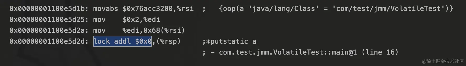 addl $0x00,(%rsp) 表示将栈顶的数据加0,即2 + 0。前面的lock前缀指令,是表示将最新的a写到主存中。