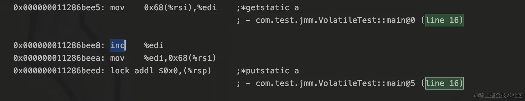 从汇编指令中可以看到,edi中的值是从a获取的。如果在执行inc自增时,其他线程修改了a的话,则edi中的值就不最新的a的值,就保证不了可见性。