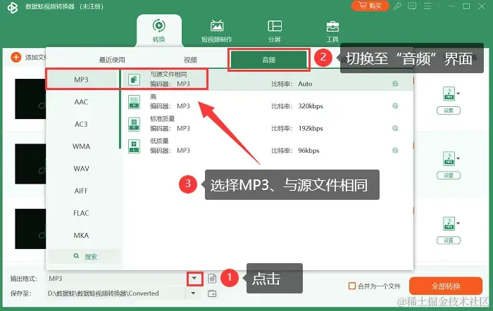 Step 2:在导入音频文件后,点击 【输出格式】 的下拉菜单,在 【音频】 界面选择 【MP3、与源文件相同】 作为转换的输出格式以及参数。该软件支持多种输出格式,确保您选择了正确的MP3格式。