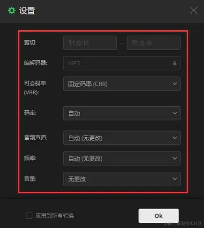 Step 3(按需):比如调整音频音量、频率、码率等。设置好后,点击 【ok】 按钮。