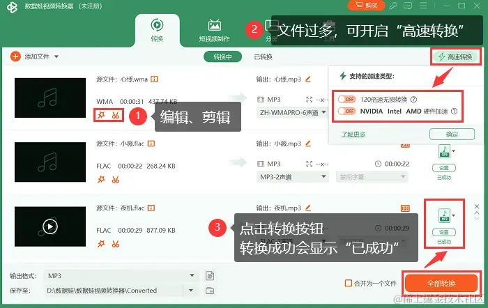 如果您经常需要进行音频格式转换,那么可以考虑使用一些桌面转换软件,比如数据蛙视频转换器。这款软件支持多种音频格式之间的转换(不仅支持视频格式转换,还能够将音频文件转换为MP3、WAV等格式),而且功能丰富,可以调整输出音质、剪辑音频等。您只需下载安装软件,按照提示操作即可完成转换。怎么把音乐转成mp3?如果您经常需要进行音频格式转换,那么可以考虑使用一些桌面转换软件,比如数据蛙视频转换器。