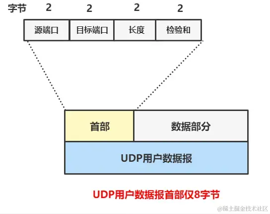 - UDP 首部是 4 个字段,每个字段两个字节,共 8 个字节