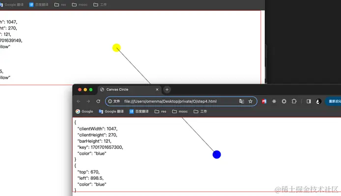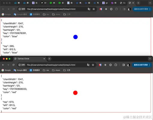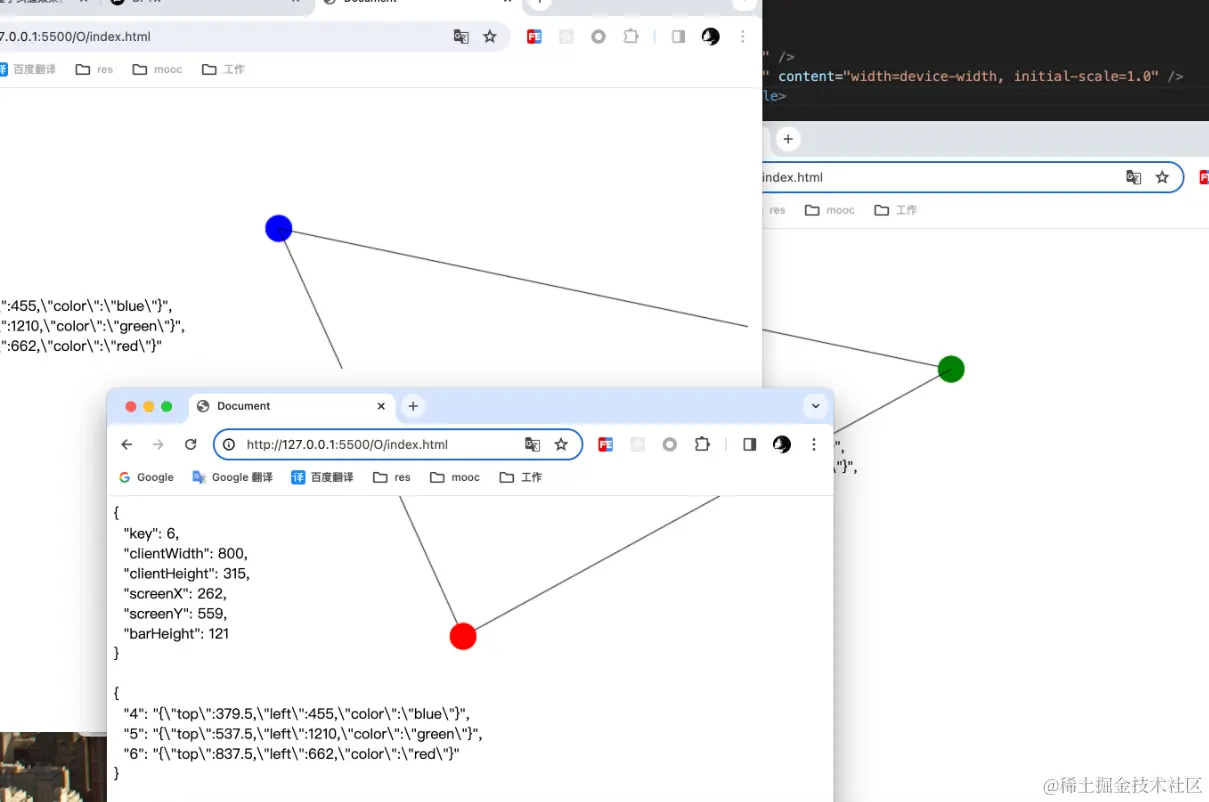 section2中记录着圆相对于 屏幕 的位置信息。新增一个窗口,现在,我们看到两个圆都有着自己的key,同时页面log和storage中都存储着两个圆的位置信息。