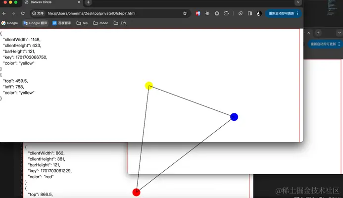 拖动浏览窗口,圆与圆之间的连线会随着浏览器窗口变化而变化。