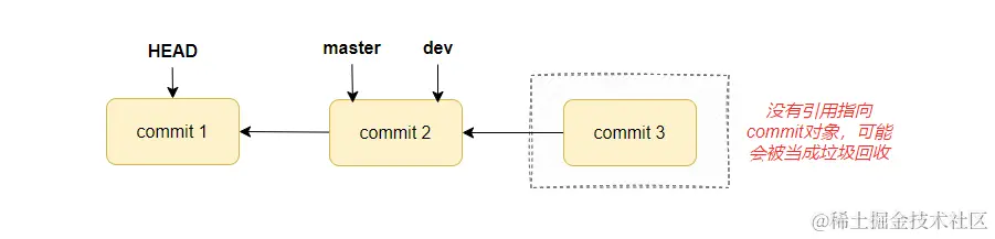 此时 HEAD 指向了一个具体的提交 ID,而不是一个分支引用。 在这种情况下,如果再次进行提交操作,创建了一个新的提交,但是此时的 master 和 dev 分支引用都不会向前移动。HEAD 也不会指向这个新提交,那么因为没有引用指向该提交,Git 的垃圾回收机制可能最后会清理掉这个提交:
