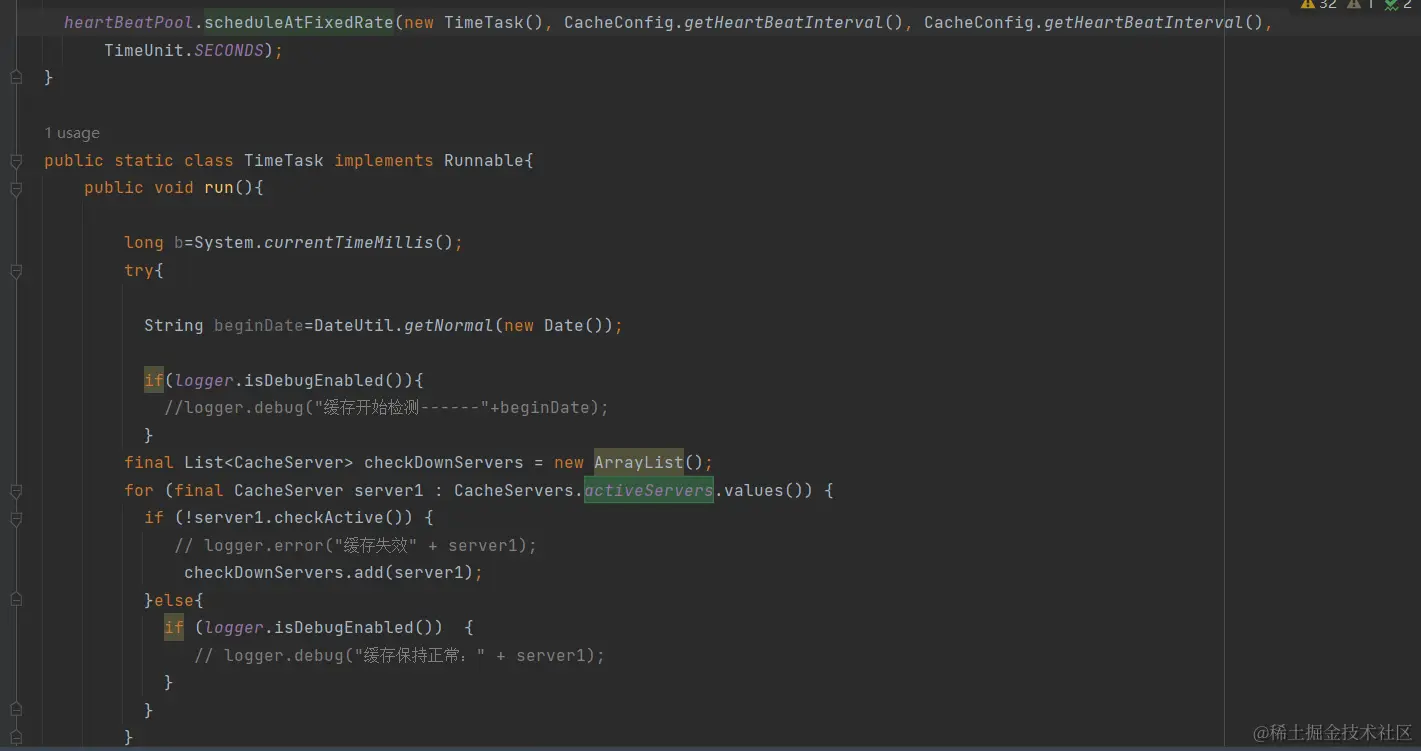 3.有一个心跳定时任务会定期检测activeServers是否可用,代码设置了10秒检测一次。