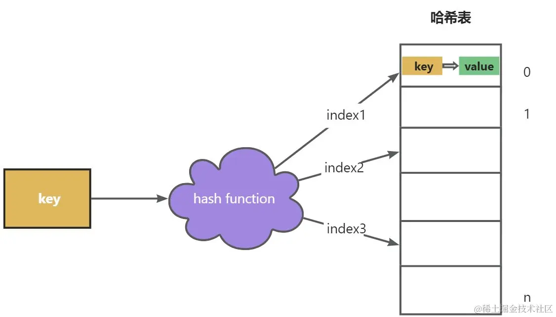 如下图,使用数组来存储键值对,键key通过哈希函数,得到一个数组下标,这个下标就是用来存储当前键值对的位置。假设哈希表的数组大小为n,那么可以使用哈希函数 index = hasCode(key) % n(key的hashCode对n取余/取模) 来获取下标,并且可以保证下标在数组有效范围内。