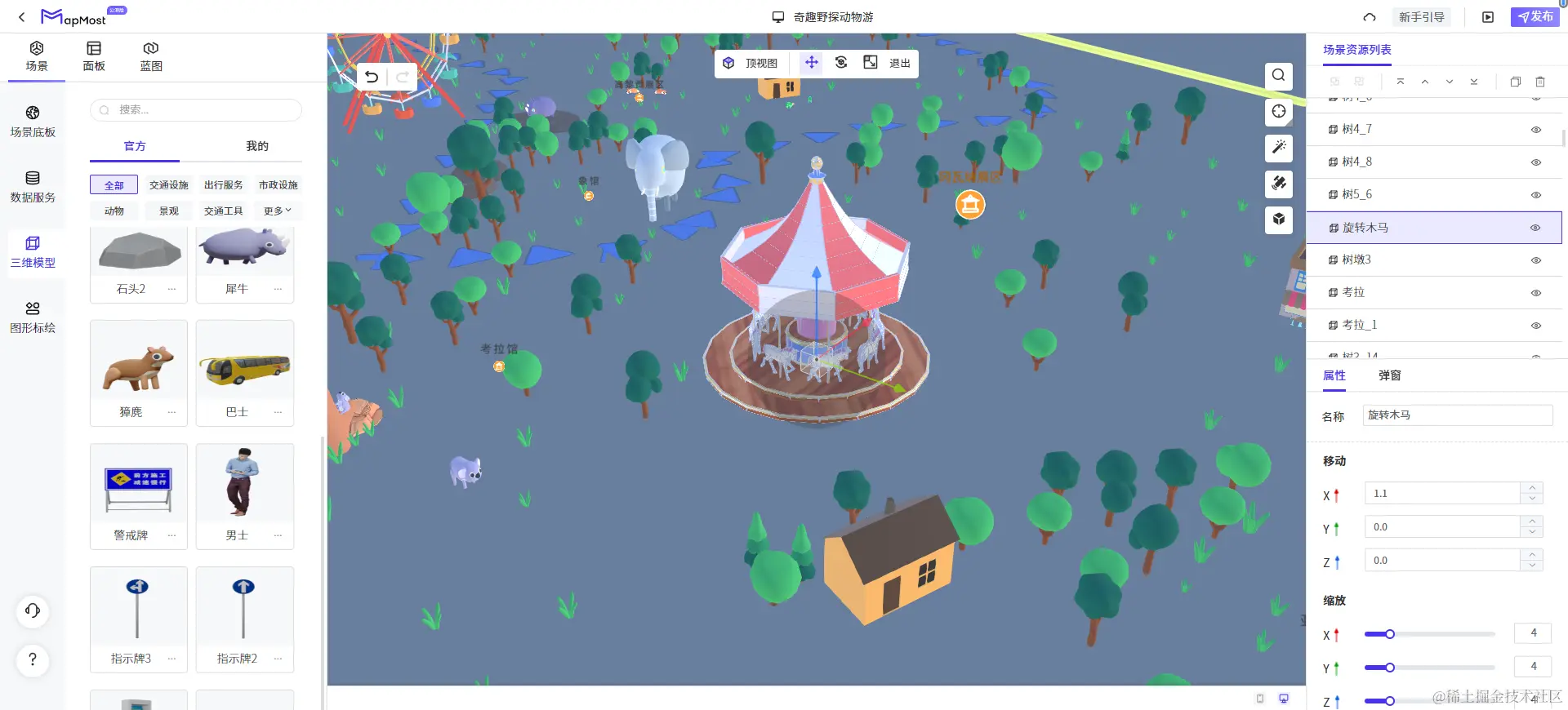 在个人主页空间这个地方可以进行创建应用,这里我们先体验一下官方提供的推荐案例的“奇趣野探动物游”这个应用案例。
