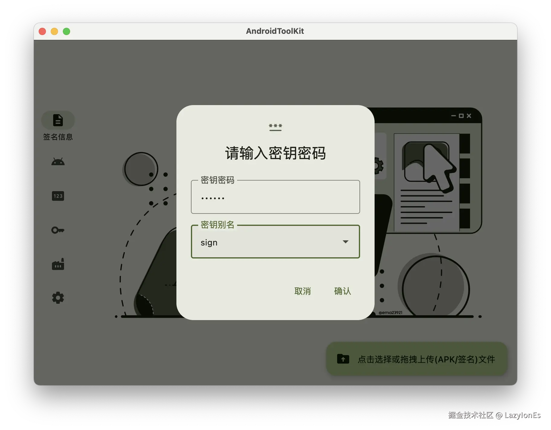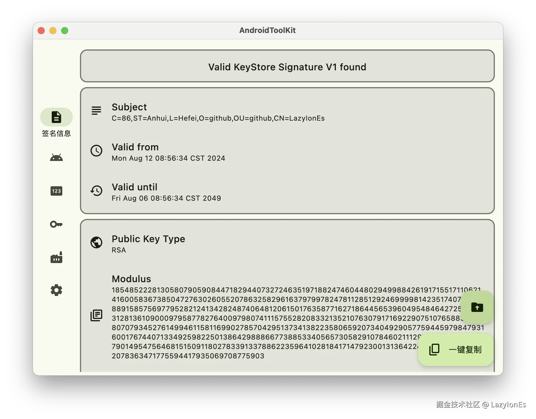 当然,图中可以看到是支持上传签名文件的,使用KeyStore获取签名的证书,并将获取到的证书转成X509Certificate类型,后续的信息获取就与上面一致了(当上传签名文件时是需要输入签名密码的)。