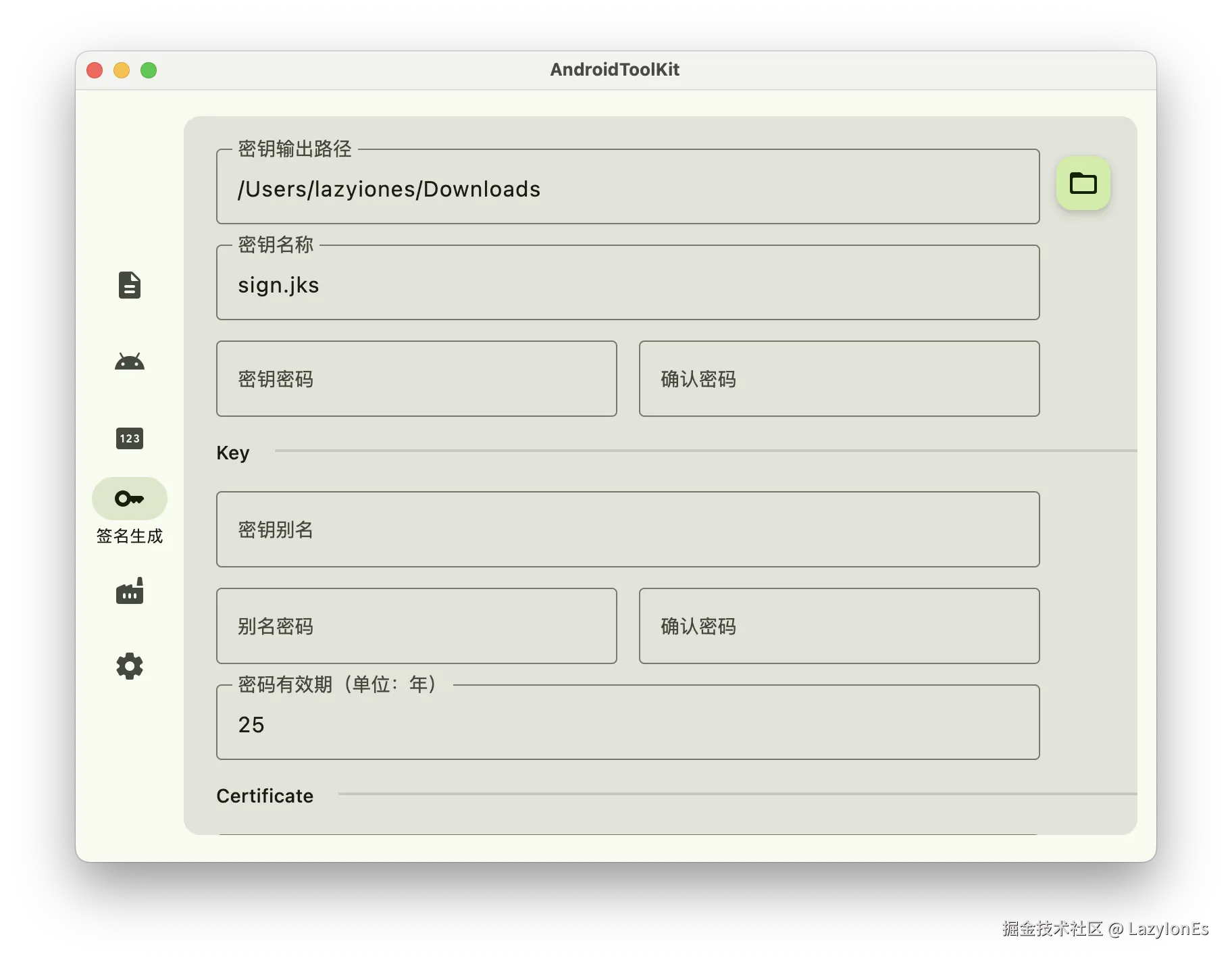 目前的最后一个功能(后续还会继续更新,增加新功能)。使用keytool工具生成签名,用的也是命令的方式,支持自定义keytool,支持选择目标密钥类型。这个大家应该都很熟悉,具体命令如下