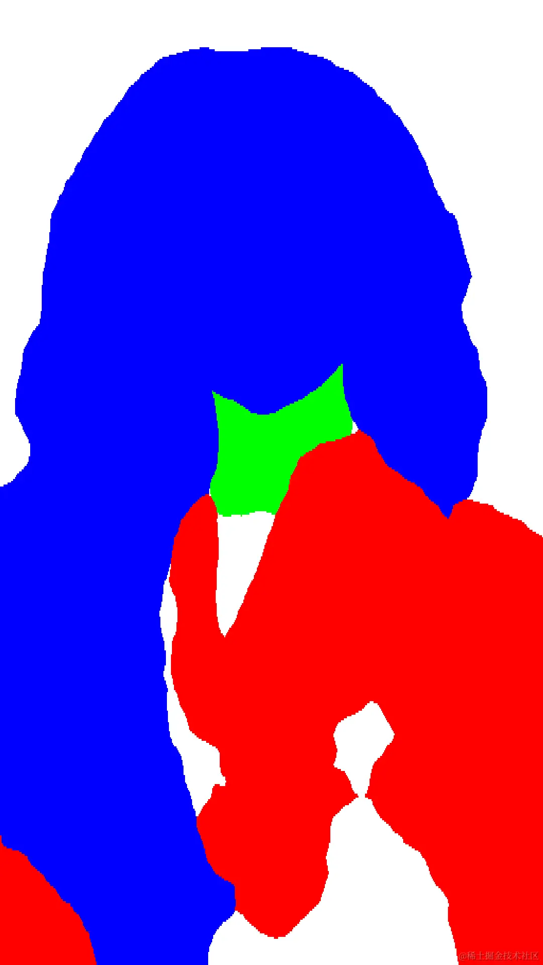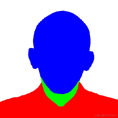 (蓝色:人脸;绿色:脖子;红色:人身;白色:背景)