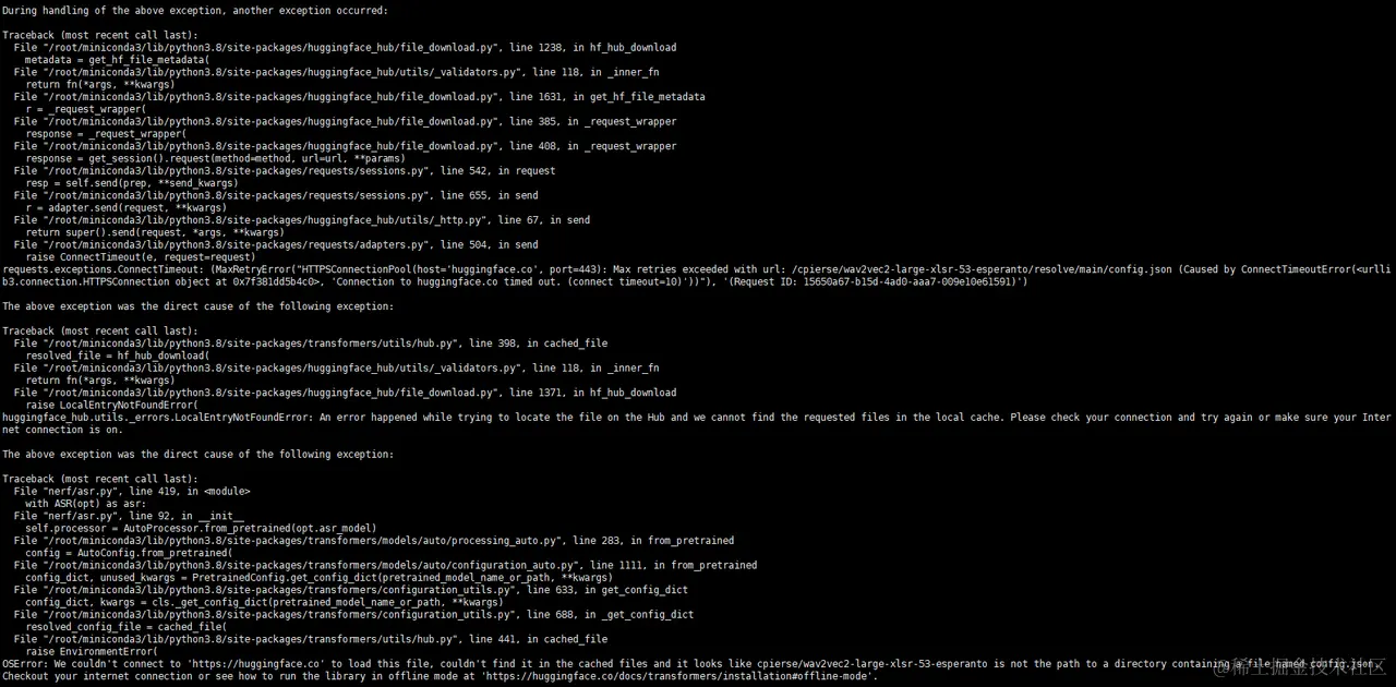 解决方法: 手动下载模型 huggingface.co/cpierse/wav… (全部文件),放在RAD-NeRF目录下的 cpierse/wav2vec2-large-xlsr-53-esperanto/ 目录中(需要新创建目录)