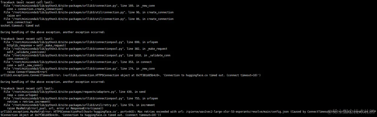 OSError: We couldn't connect to 'huggingface.co' to load this file, couldn't find it in the cached files and it looks like cpierse/wav2vec2-large-xlsr-53-esperanto is not the path to a directory containing a file named config.json. Checkout your internet connection or see how to run the library in offline mode at 'huggingface.co/docs/transf…'.