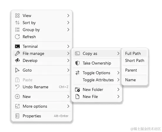 这项目是一个用于管理 Windows 文件资源管理器上下文菜单的程序。简单来说,就是扩展了 Windows 右键菜单的功能。该工具免费、开源、无广告、轻巧,支持所有文件系统对象,如文件、文件夹、桌面和任务栏。它提供了一系列提升效率的功能,包括拷贝文件地址、快速打开目录、终端打开、自定义外观以及复杂的嵌套菜单等。