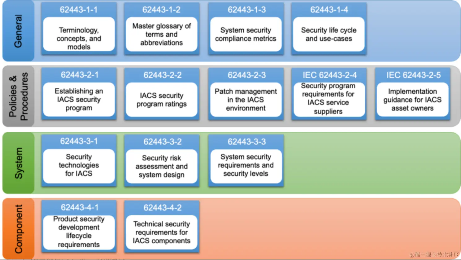 - 4-2 部分 - IACS 组件的技术安全要求: 描述基于安全级别的 IACS 组件的要求。组件包括嵌入式设备、主机设备、网络设备和软件应用程序。