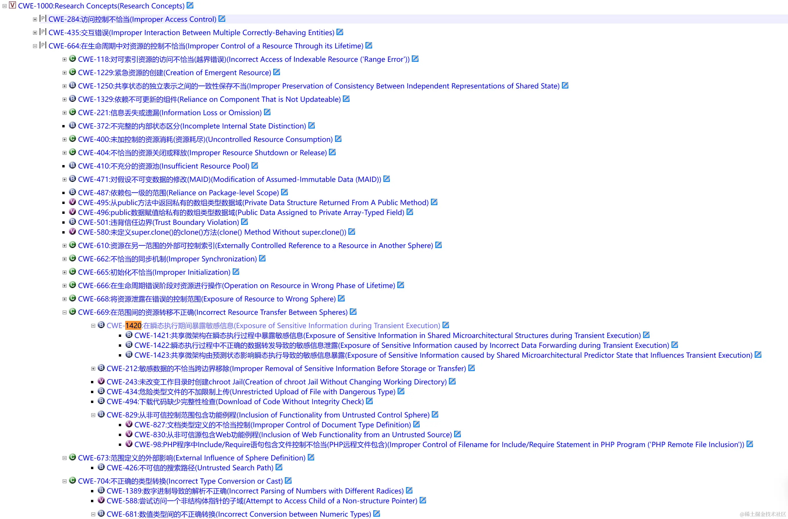 - 按照 CWE-1400:软件安全保障综合分类 中的分类汇总如下: