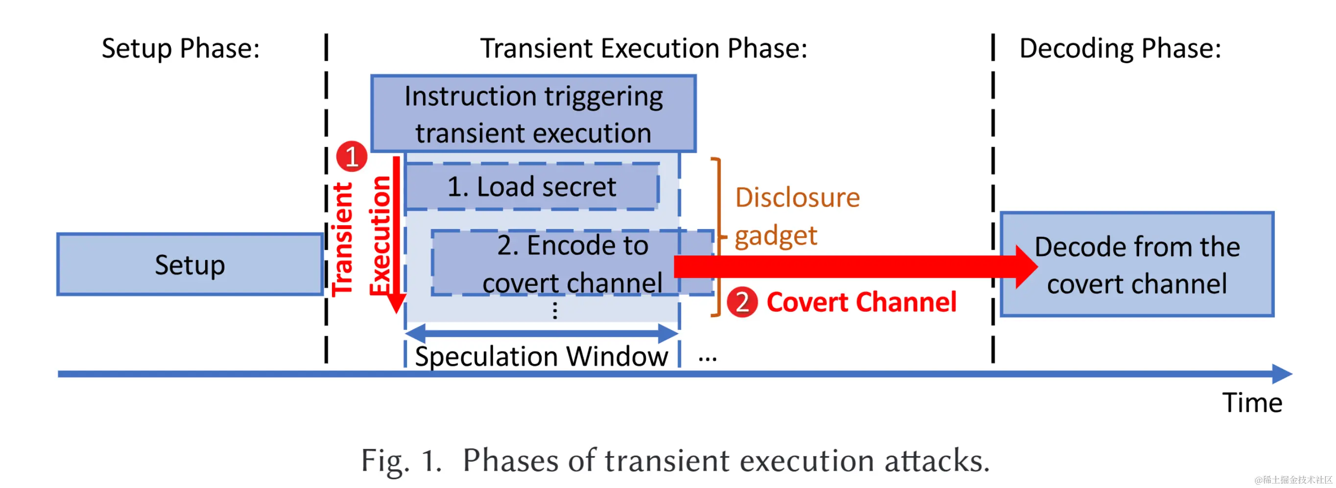 瞬态执行与隐蔽通道相结合会导致瞬态执行攻击,从而危及系统的机密性。如图所示,在这种攻击过程中,机密(也称为敏感数据)在瞬态执行期间是可用的——这将瞬态执行攻击与传统的隐蔽通道攻击区分开来,在传统的隐蔽信道攻击中,数据被认为总是对发送方可用,而不仅仅是在瞬态执行过程中。在瞬态执行期间访问秘密数据后并将其编码到隐蔽通道中,然后攻击者可以从隐蔽通道中提取(即解码)机密数据。