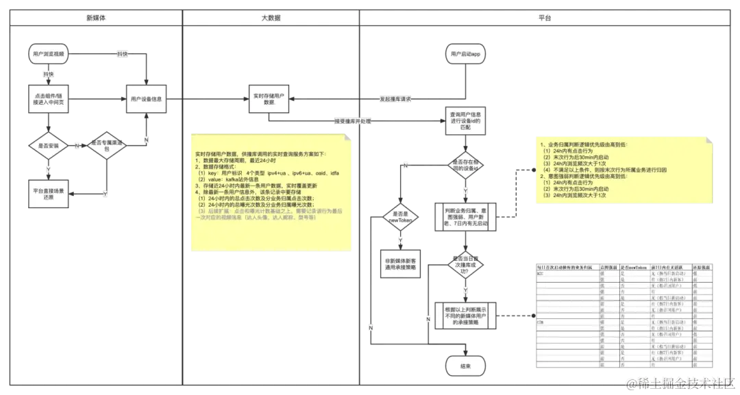 用户通过新媒体浏览视频且有点击行为,则判定该用户是有购买意愿(强意愿&弱意愿),则需要对用户打标并进行端内承接(业务归因),如何对用户进行个性化承接的这个行为则需要执行大数据的撞库策略。撞库逻辑 + 强弱意图判定 + 业务归因
