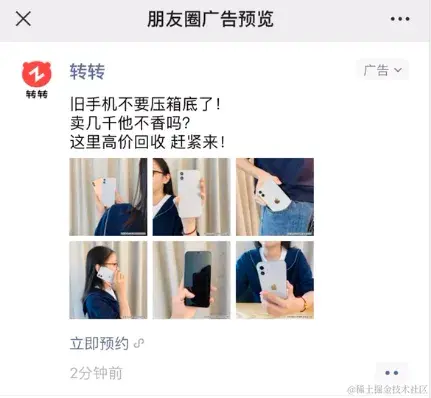 | 微信朋友圈数据回传分为:(接口由大数据封装统一封装处理) ● 下单回传 - [下单页下单成功行为] - ad.zhuanzhuan.com/zz/ad/apple… ● 关键页面(目标页)回传 - [投放页展现行为] - ad.zhuanzhuan.com/zz/applets/… ● 新用户注册成功回传 - [主程序内统一处理] - ad.zhuanzhuan.com/zz/ad/apple… |