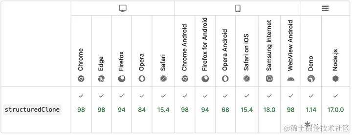 值得庆幸的是 structuredClone 在所有主流浏览器中都受支持,也支持Node.js和Deno。