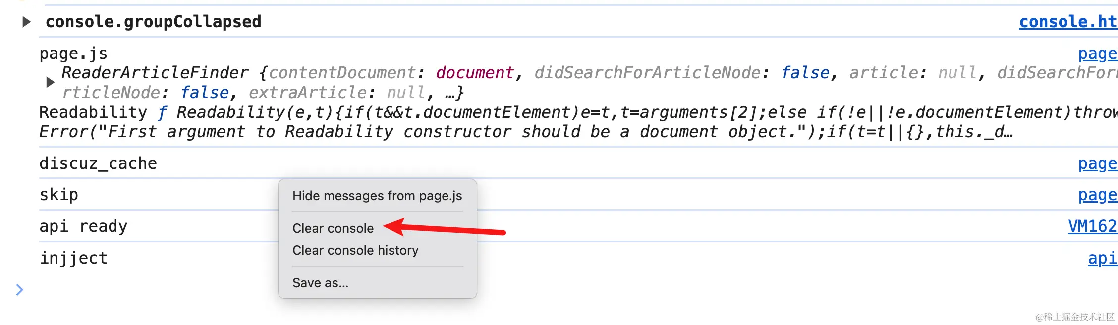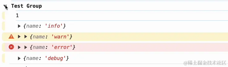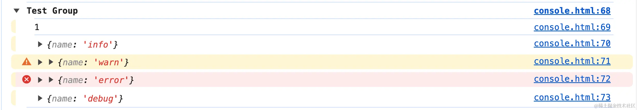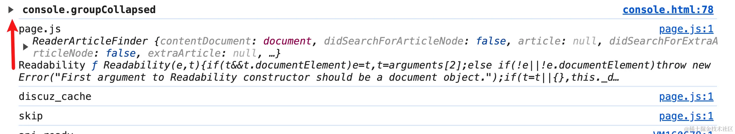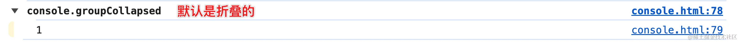 console.groupCollapsed() 方法在 Web 控制台上创建一个新的分组。与 console.group() 方法的不同点是,新建的分组默认是折叠的。用户必须点击一个按钮才能将折叠的内容打开。